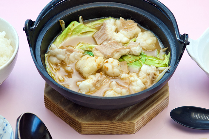コラーゲンたっぷりのもつでお肌はプルプル、野菜もいっぱい食べられてヘルシー。合わせ味噌のスープは癖になる美味しさです
