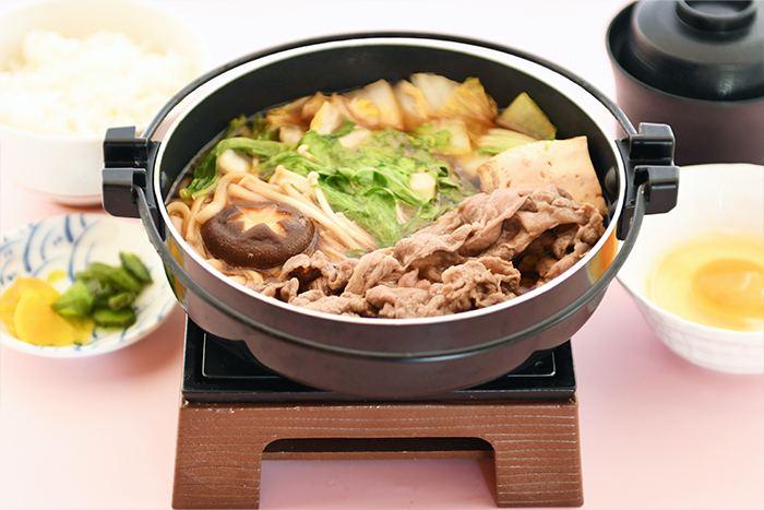 牛肉とたっぷり野菜を甘辛い割り下で煮込んだ、あつあつのすき焼き鍋定食です