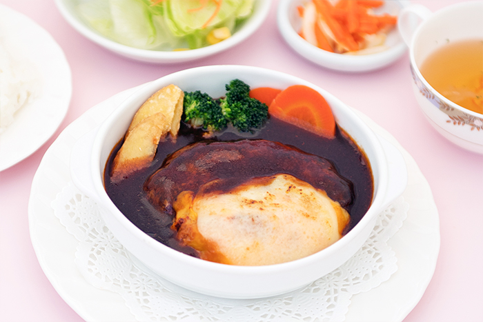 アツアツのソースとチーズがからんだハンバーグは、最初のひと口から最後までコクのある味わいが続きます