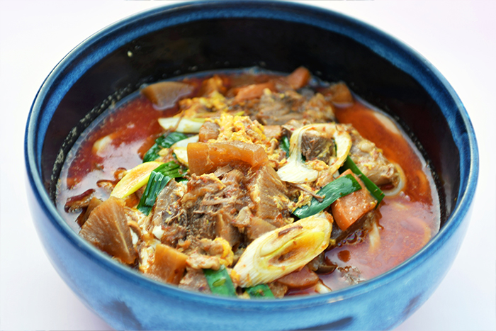 ピリ辛のスープが特徴のユッケジャンクッパ。牛肉や野菜、卵がたっぷり入った栄養満点の一品